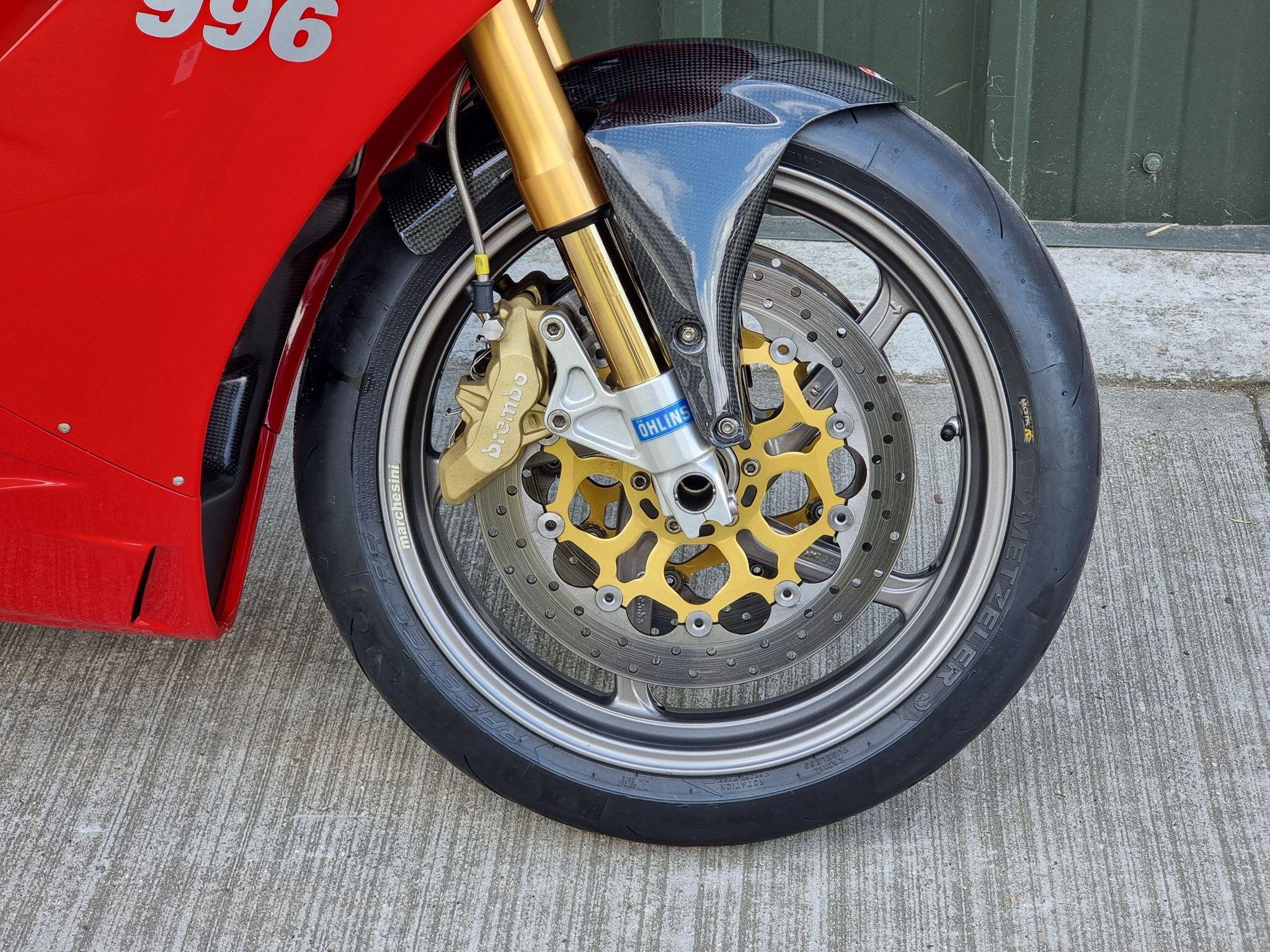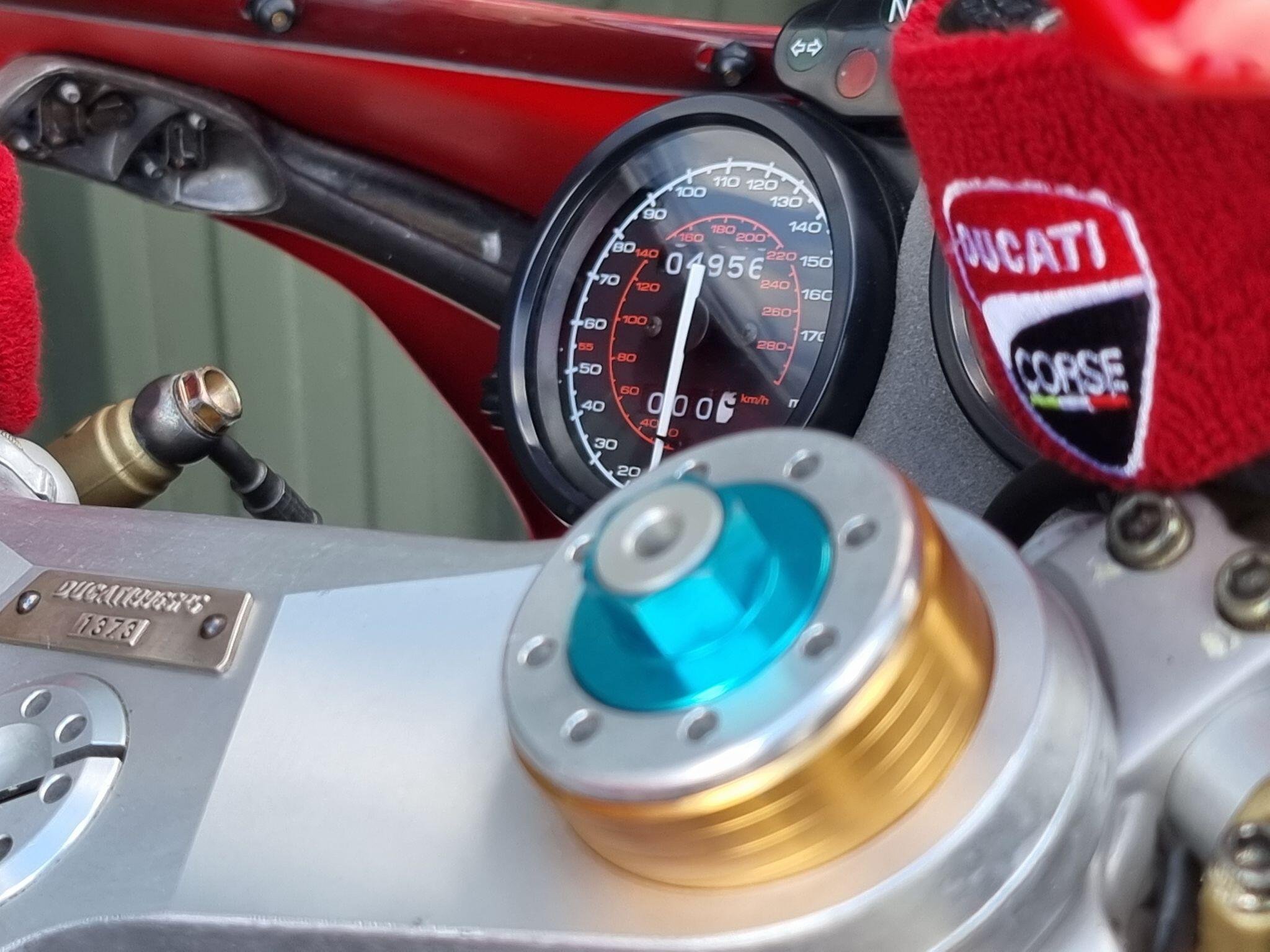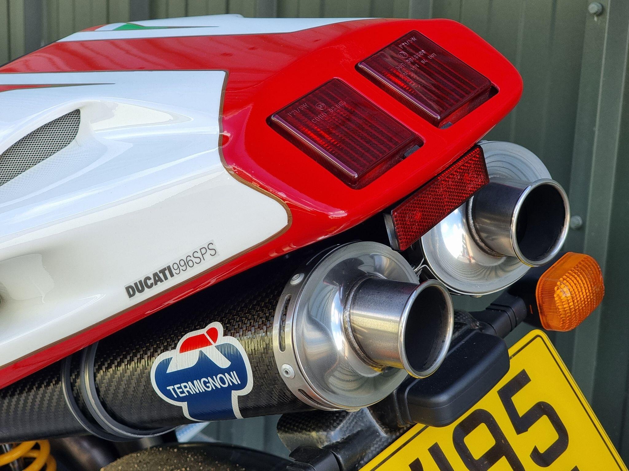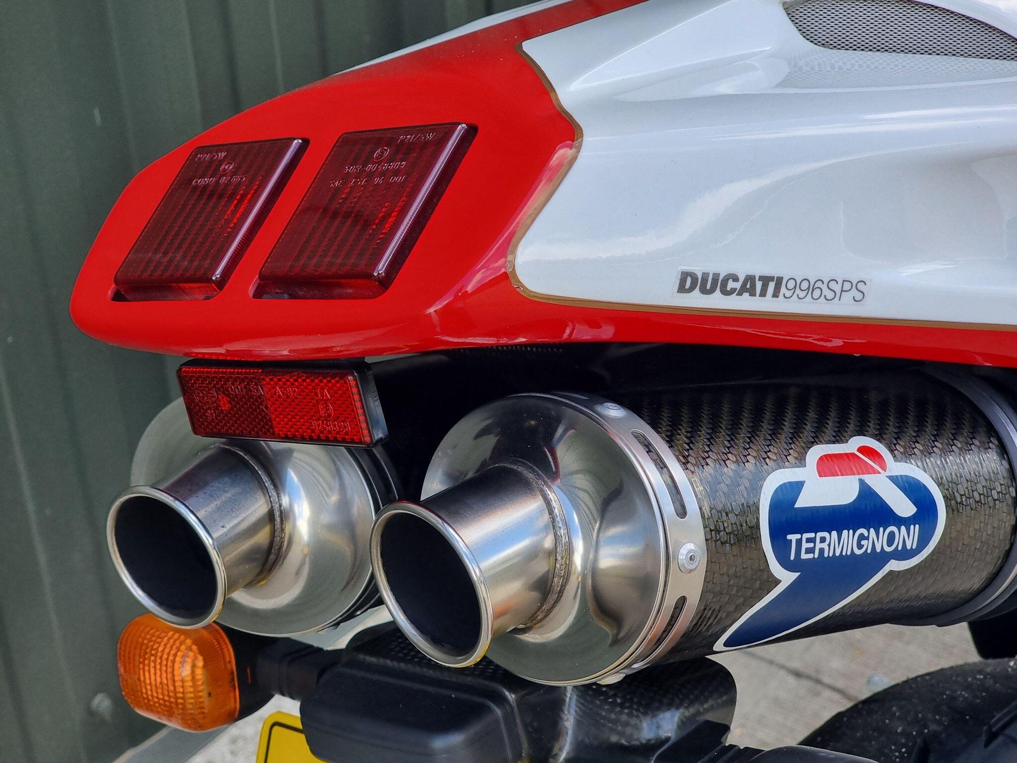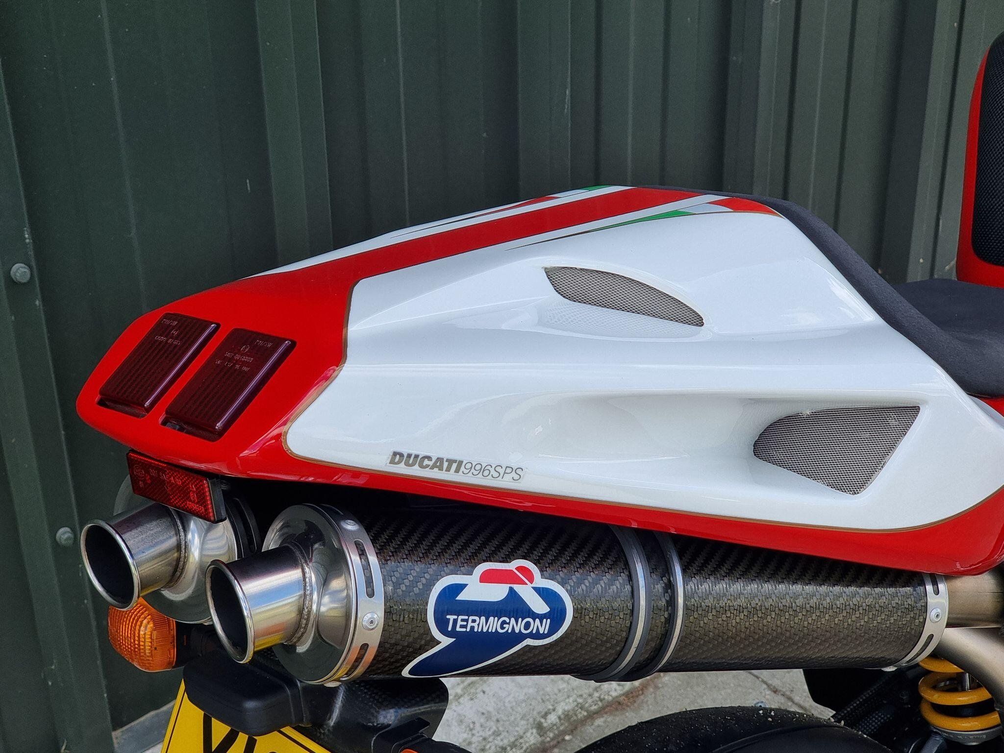 We have this rather special Ducati 996SPS to present. This example is in superb condition and has covered just 4952 miles from new. Originally supplied new into Singapore hence the original MPH clocks. RHD lights and Speedometer. It was part of a very fine collection until imported into UK in 2007. This bike is number 1373 of 1780. This bike is fitted with the all important Carbon Termignoni exhausts, Ducati five spoke Magnesium alloys, rear sets and various carbon upgrades including air pipes, rear swing arm, chain guard and exhaust guards.